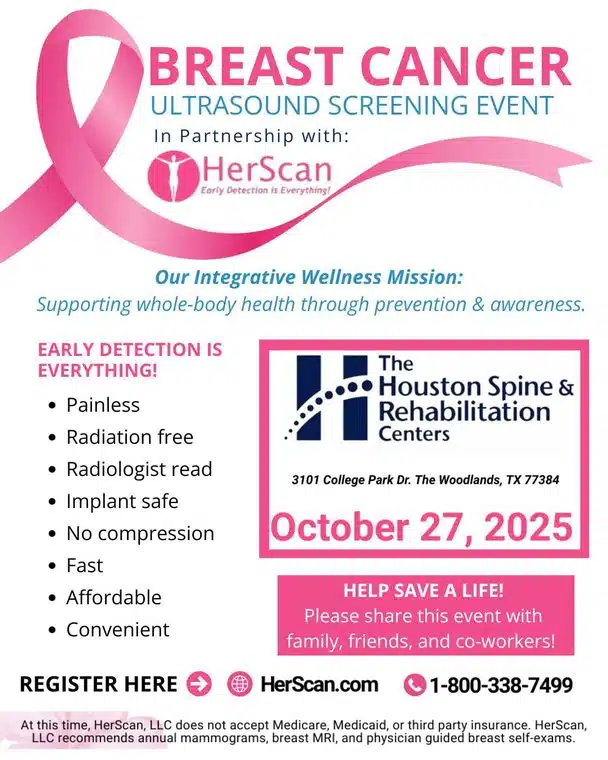THE WOODLANDS, TX — In honor of Breast Cancer Awareness Month, Houston Spine & Rehabilitation Centers (HSRC) is partnering with HerScan, a leading mobile breast ultrasound screening provider, to host a Breast Ultrasound Screening Event on Monday, October 27, 2025, at the HSRC Woodlands location.